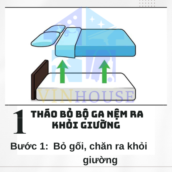 Sau đó tháo các gối ngủ, bọc chăn để mang đi giặt. Tiếp đến bạn gấp chăn màn và chuyển các đồ vật trên giường sang vị trí khác để dễ dàng vệ sinh.