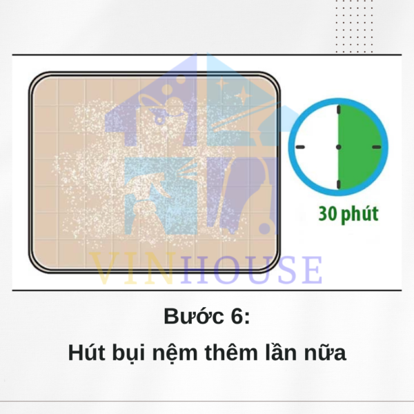 Bạn nên đặt đồng hồ bấm giờ hoặc ghi nhớ chất Baking soda được rắc ở trên mặt đệm được khoảng 30 phút thì hãy hút sạch baking soda ra khỏi đệm một lần nữa. Thời điểm này, baking soda đã hấp thụ hết mùi hôi và được máy hút bụi hút hết.