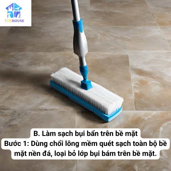 Bước 1: Dùng chổi lông mềm quét sạch toàn bộ bề mặt nền đá, loại bỏ lớp bụi bám trên bề mặt.