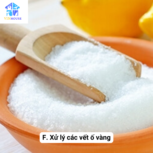 Đối với vết ố vàng trên nền đá do tiếp xúc nước, bạn có thể sử dụng các dung dịch tẩy trên cơ sở axit citric hoặc axit phosphoric. Thoa đều hỗn hợp lên vùng bị ố vàng và để tác động trong 5-10 phút rồi dùng bàn chải chà nhẹ. Sau đó xả sạch lại bằng nước.