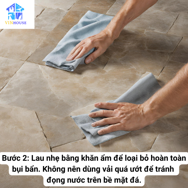 Bước 2: Lau nhẹ bằng khăn ẩm để loại bỏ hoàn toàn bụi bẩn. Không nên dùng vải quá ướt để tránh đọng nước trên bề mặt đá.